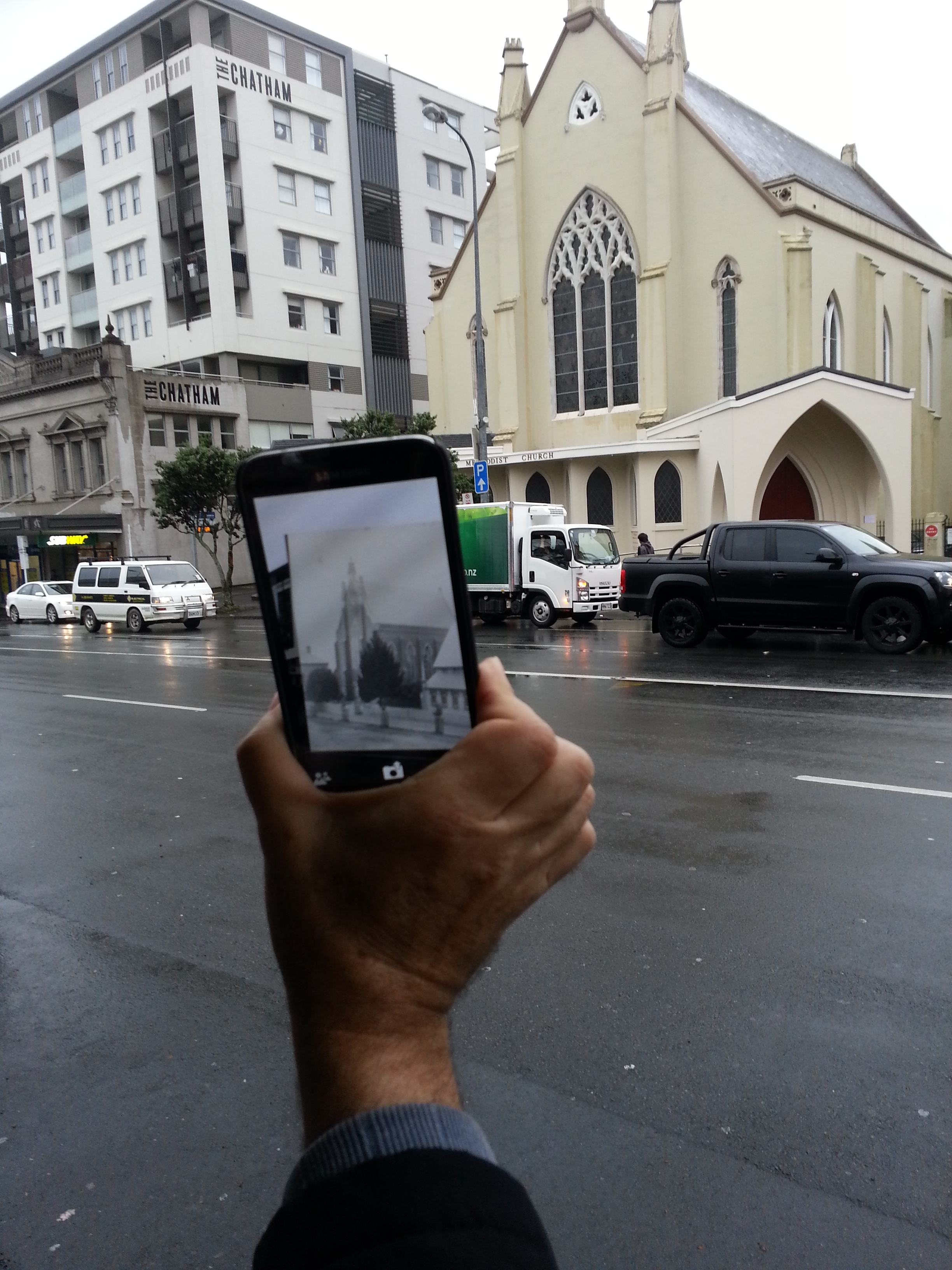 September 12, 2014 Augmented Walking in the Rain 2448 × 3264 20140912_165812 Documentation of “Finding the Ghosts of K Road” © Tracey Benson 2014