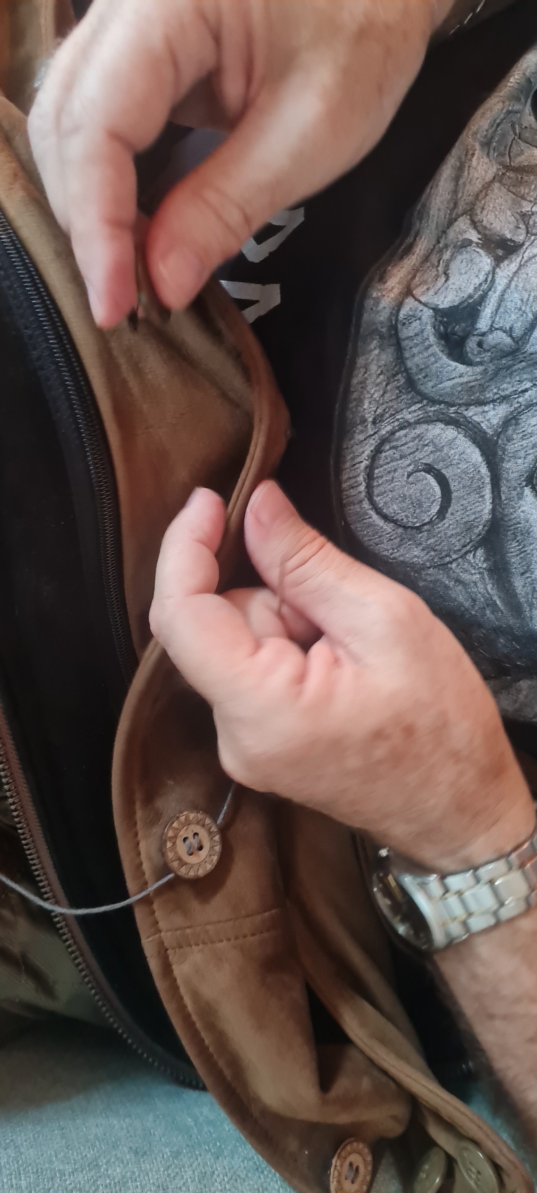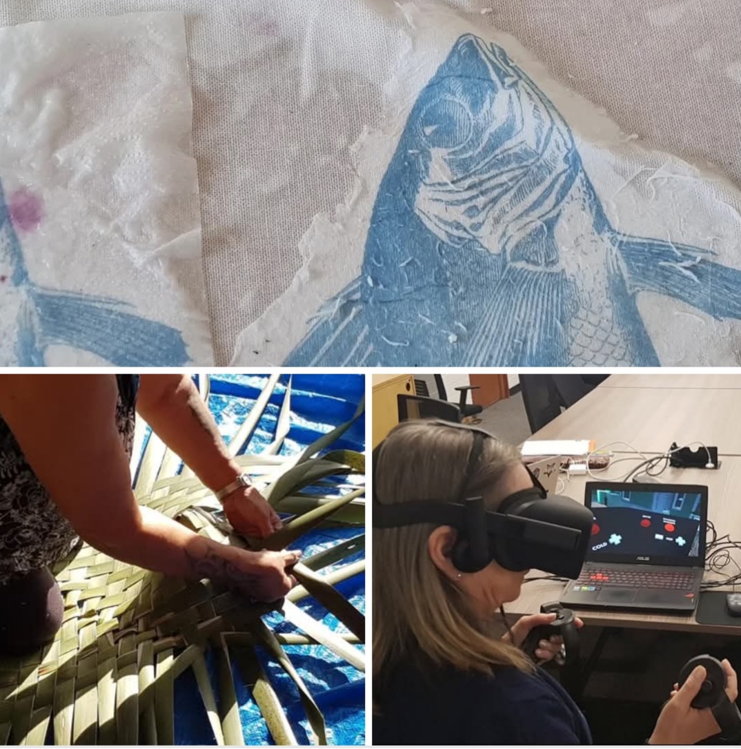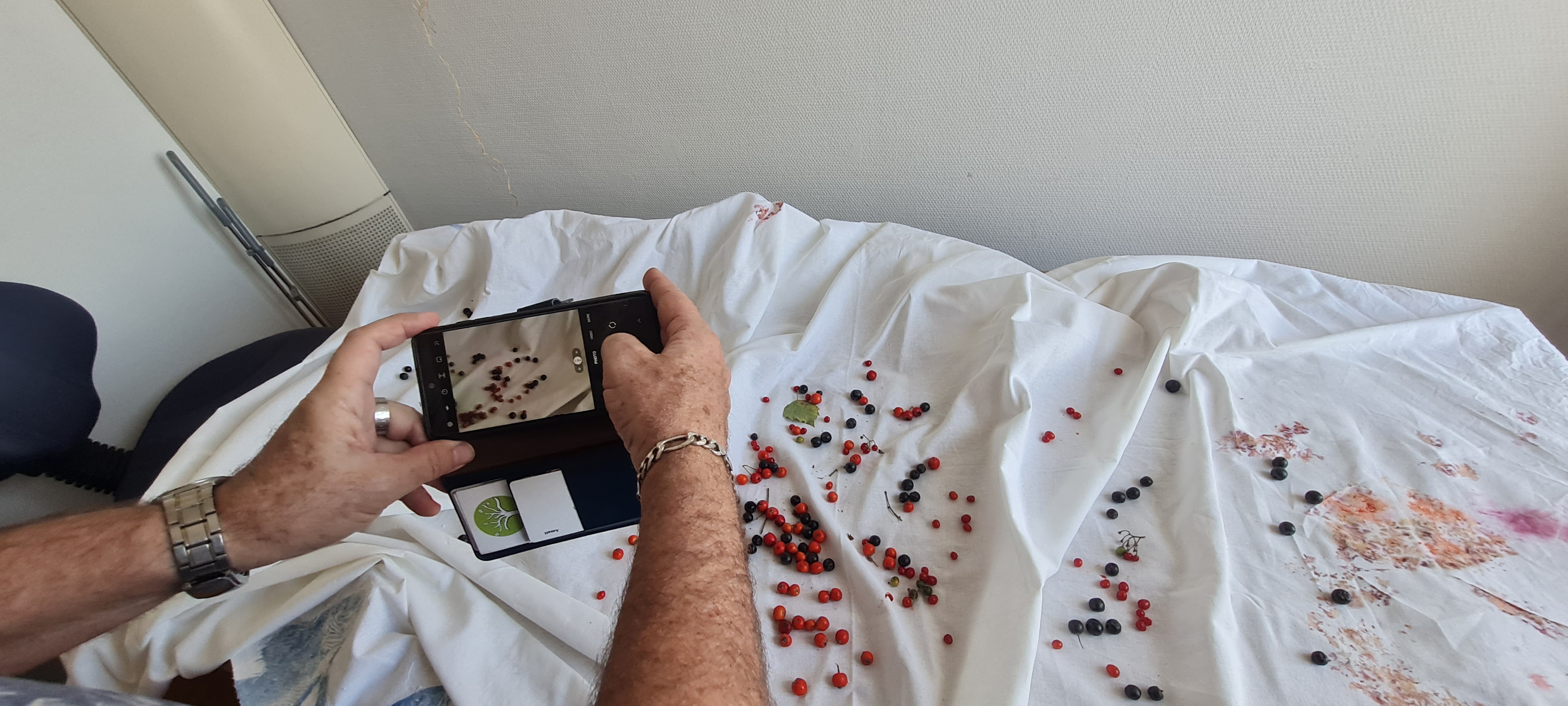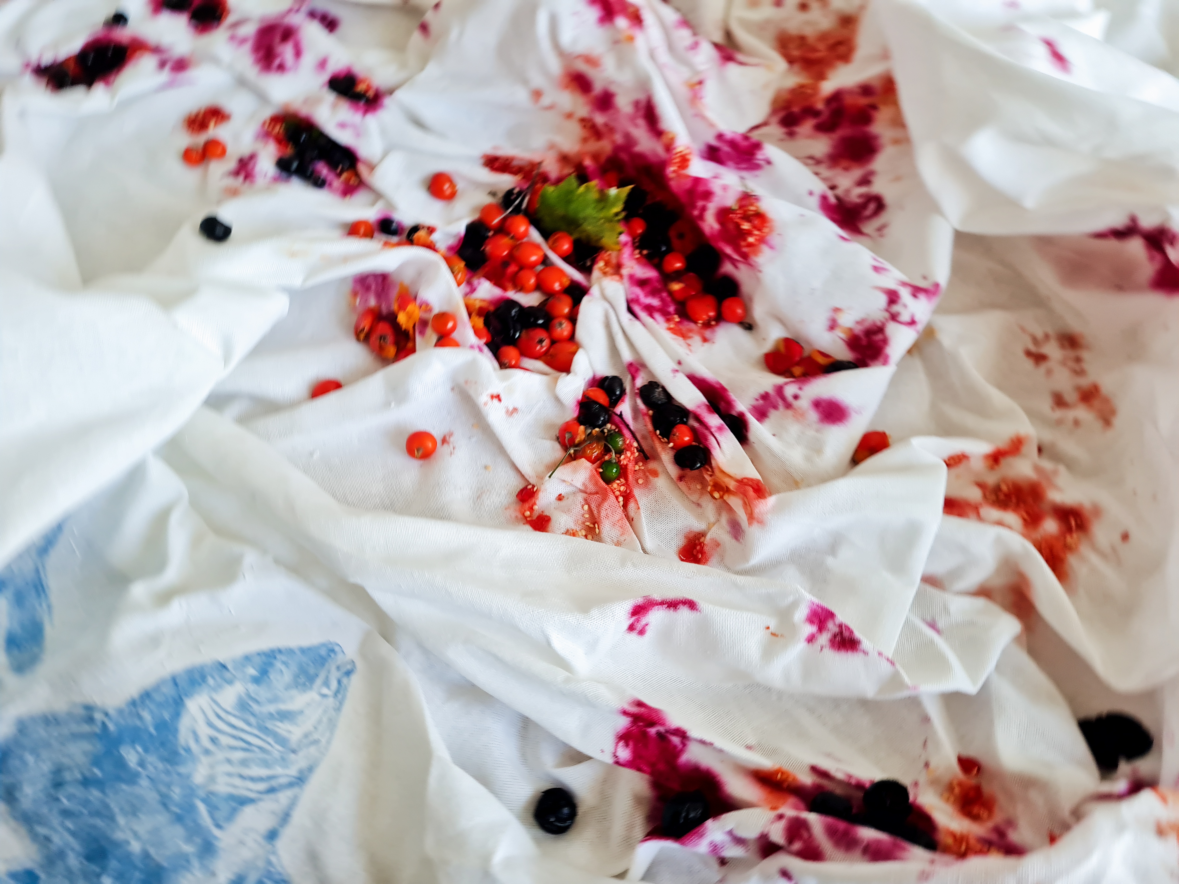 Here are some snaps of creative hands – loved seeing the skillful repair job Marty did on his newly scored suede jacket. We also had fun squishing foraged berries into the evolving tablecloth… It will come home with me if I can get it through customs – there are more fish to add to the layers ❤
